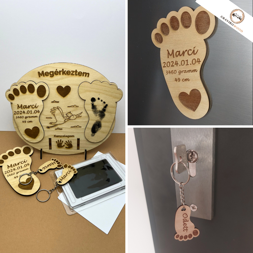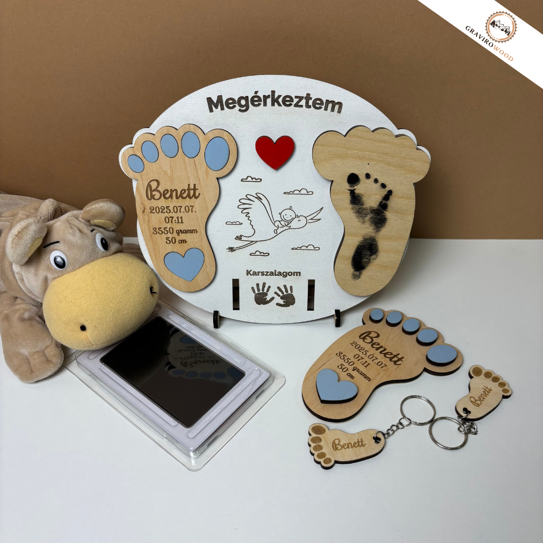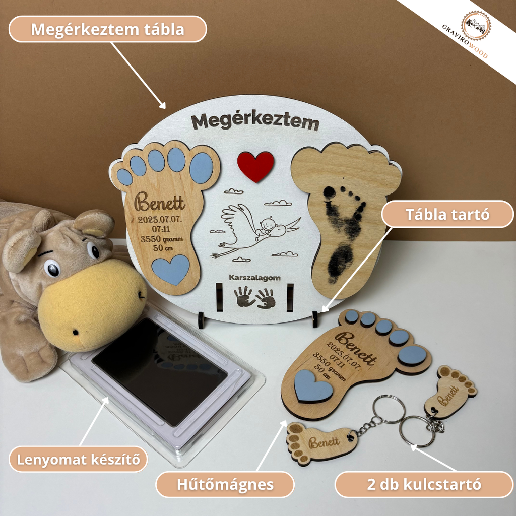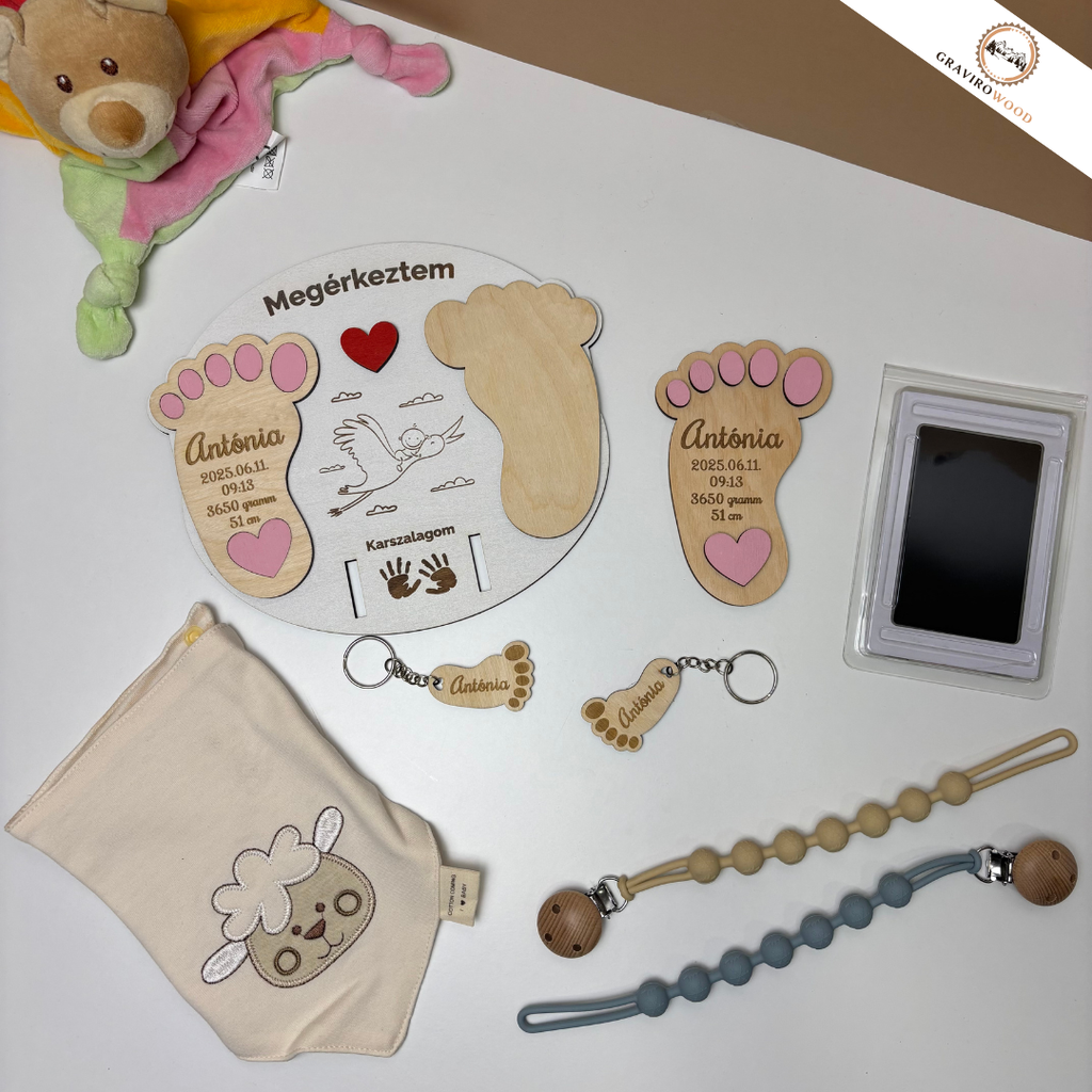"Megérkeztem" tábla (225mm x 195 mm): Ezen a csodás táblán helyezheted el a baba lábnyomát, hogy megmaradjon örökké emléknek. A tábla tartalmaz egy karszalag tartót, hogy a kórházban kapott baba karszalag is méltó helyet kapjon.