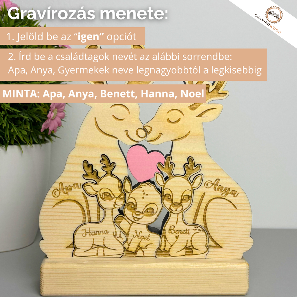 Tedd személyessé és egyedivé ezt a különleges műalkotást egyedi gravírozással! Válaszd ki hány tagú rénszarvas családot szeretnél, írd be a család tagjainak nevét és mi már készítjük is őket.
